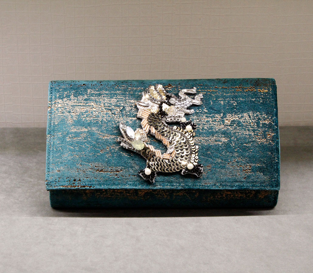 Made with blue velvet fabric, with bead ornament, crystals, zirconia